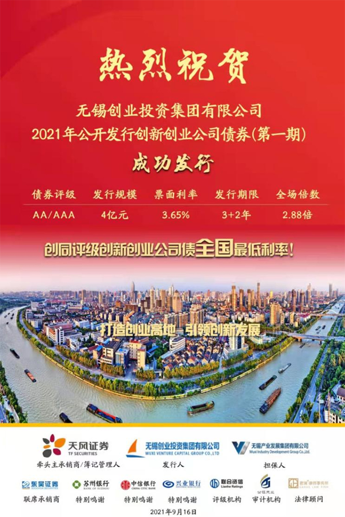 | 利率全國(guó)最低!無(wú)錫創(chuàng)投集團(tuán)成功發(fā)行創(chuàng)新創(chuàng)業(yè)公司債券 |