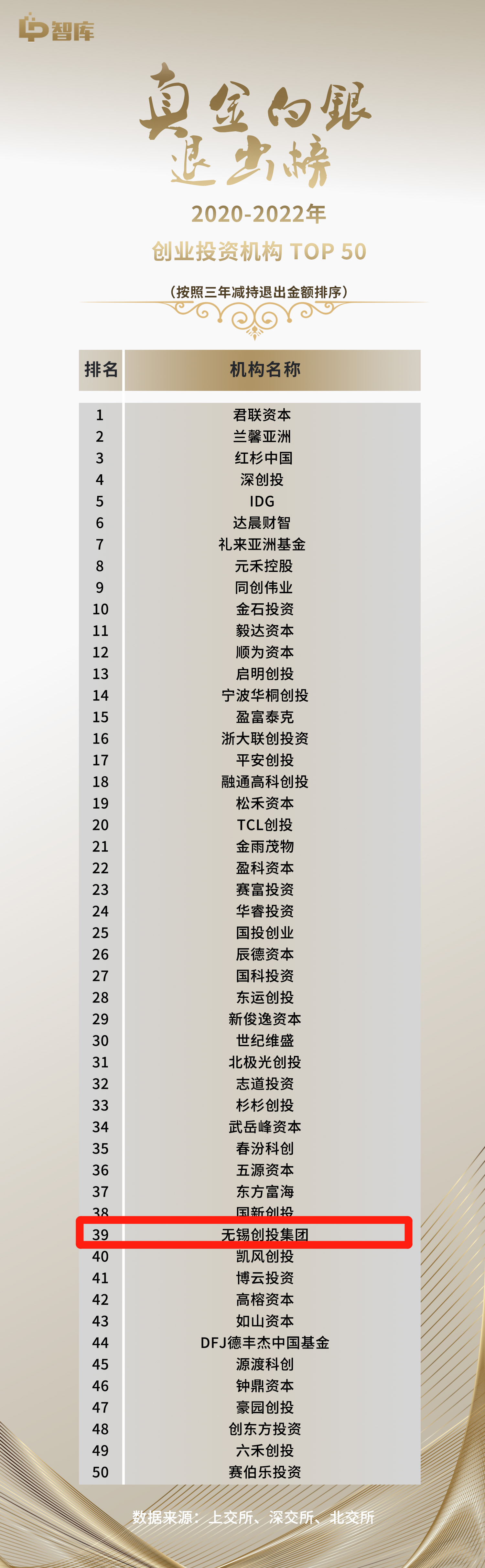 | 創(chuàng)投集團榮獲《真金白銀退出榜》2020-2022年創(chuàng)業(yè)投資機構TOP50榜第39名 |